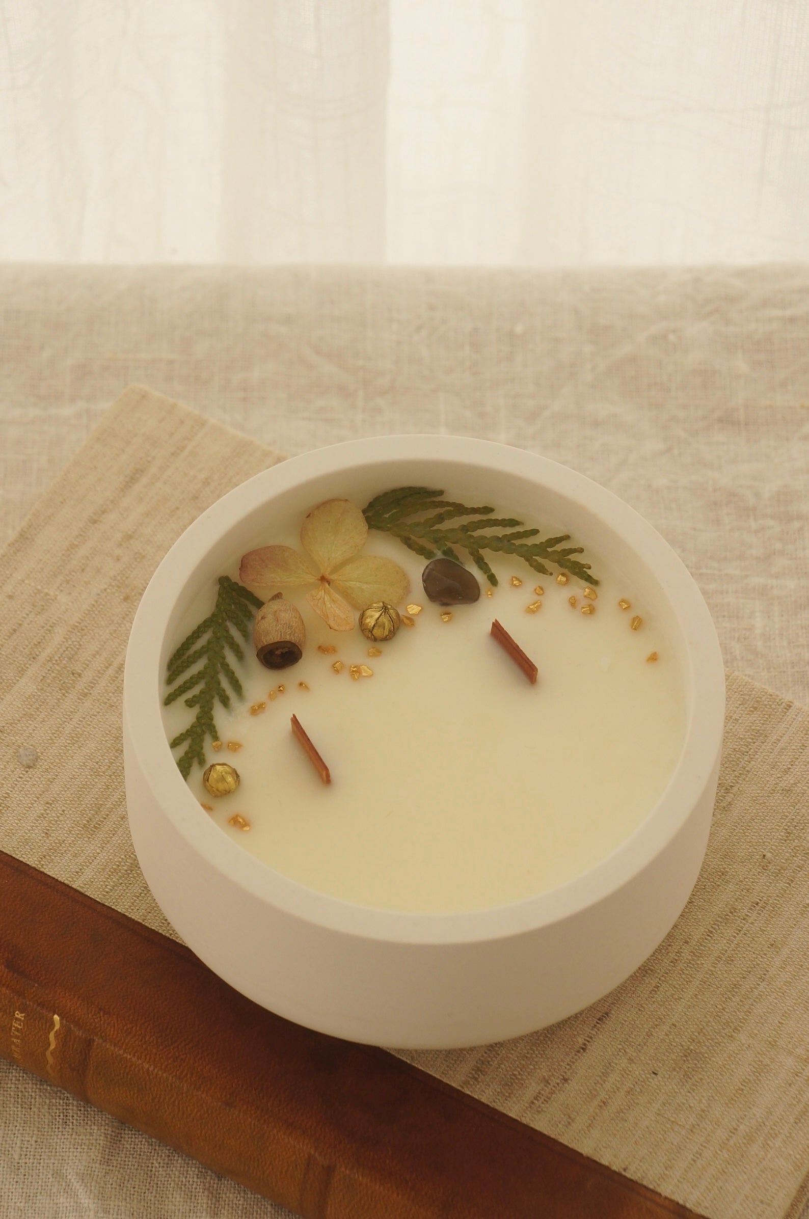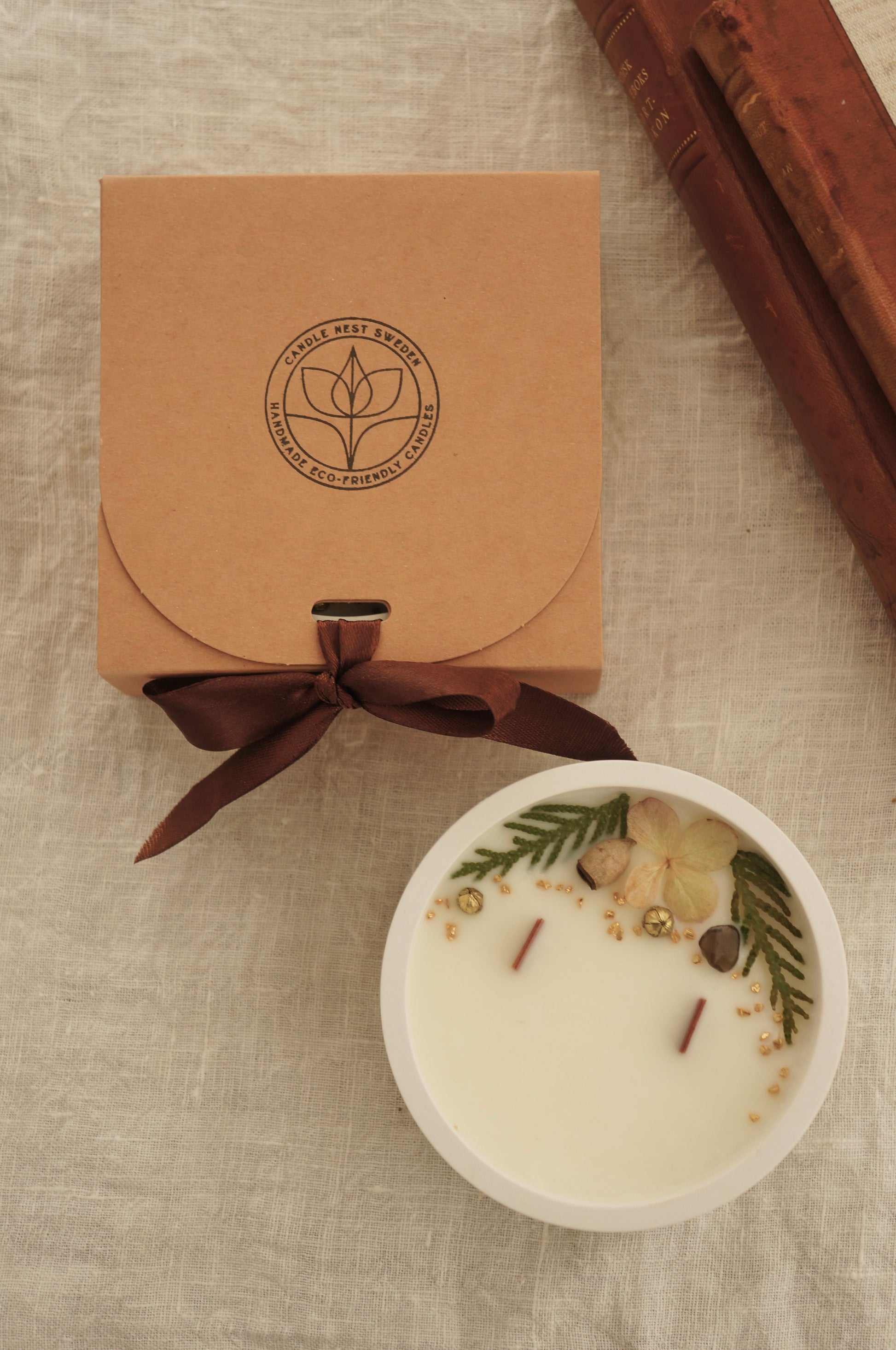 Låt detta exklusiva doftljus fylla ditt hem med en behaglig, mjuk och sofistikerad doft. Handgjord i Mölndal och fylld med 100 % rapsvax från Skåne, skapar det en harmonisk känsla med sina sprakande trävekar och vackra, ekologiska blommor som sakta sjunker ner i det smälta vaxet. Ljuset sprider en ljuvlig väldoft som är subtil och elegant, perfekt för en avkopplande stund eller som en smakfull inredningsdetalj.